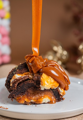 Recheio de caramelo salgado combinado com mousse de Ninho e chocolate meio amargo, criando o equilíbrio perfeito entre doce e sofisticado